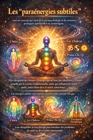 Les “paraénergies subtiles” sont un concept qui vient de la parapsychologie et de certaines pratiques spirituelles ou ésotériques. Elles désignent des formes d’énergie qui ne sont pas identifié à l’heure actuelle par la science traditionnelle, mais qui influence notre santé, notre bien-être et notre conscience.